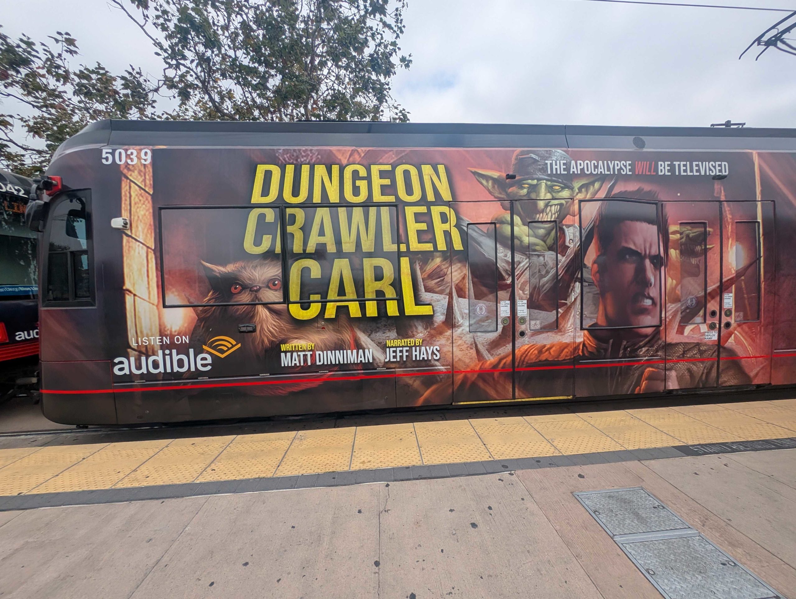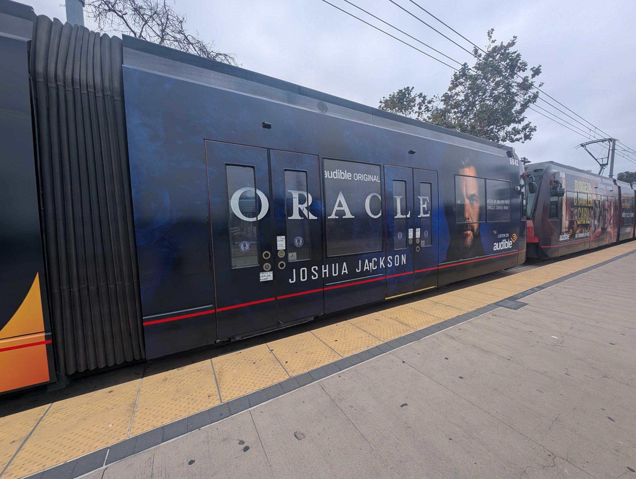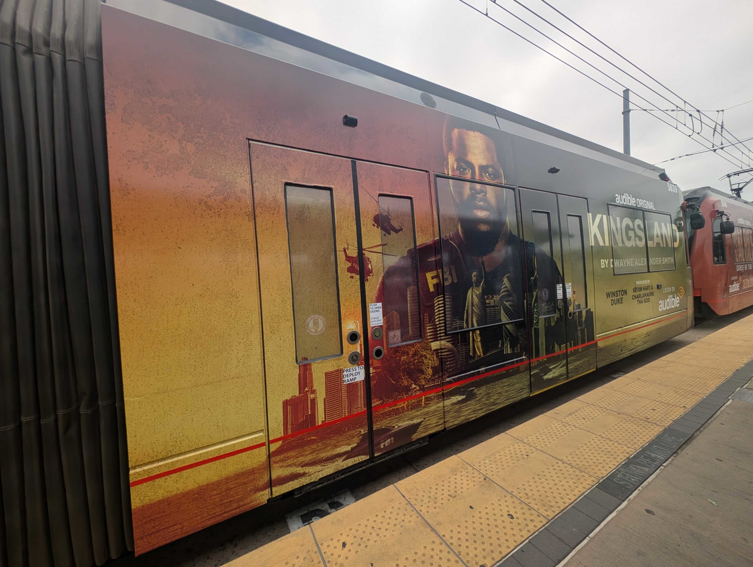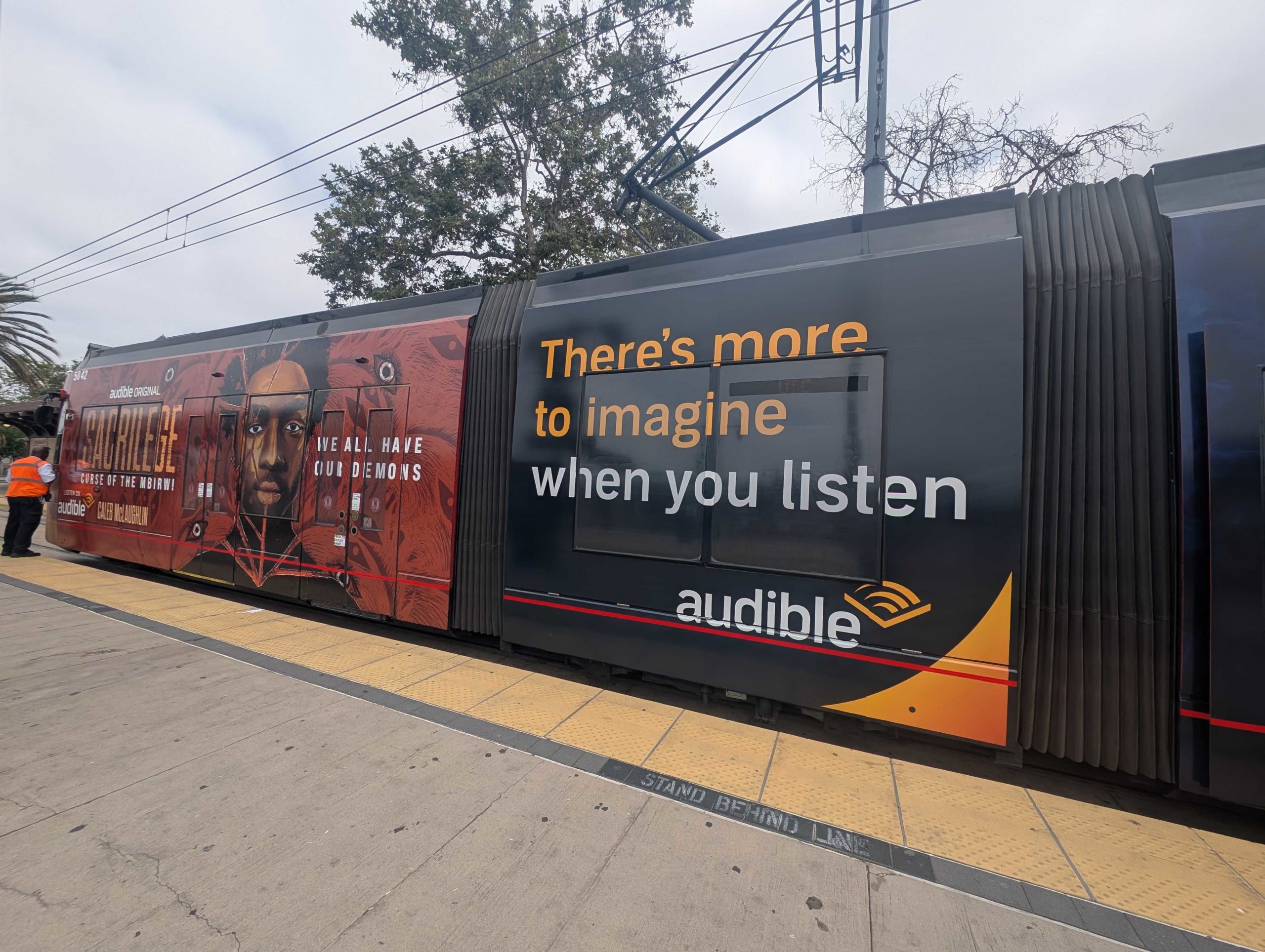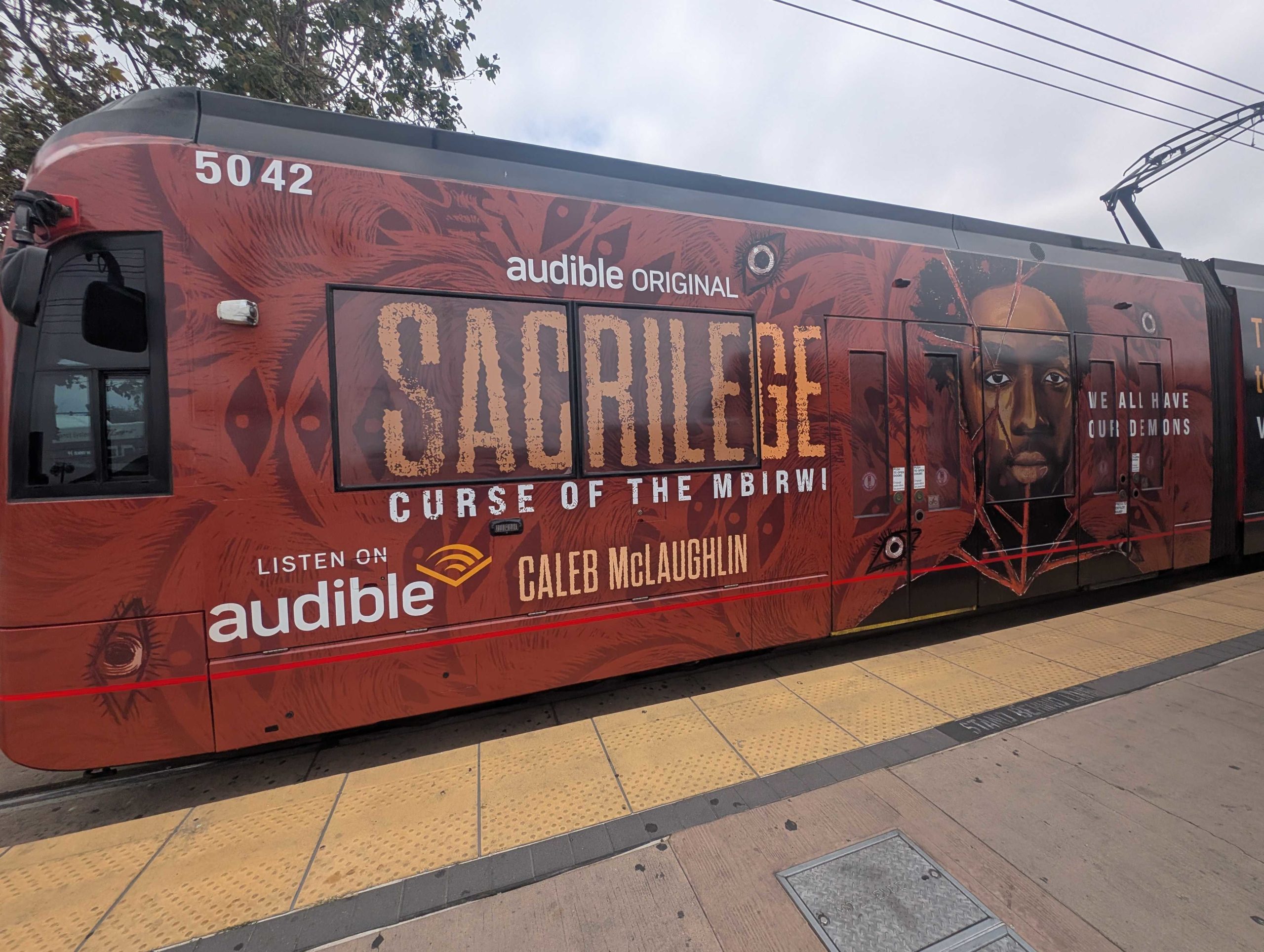 Did you think the trolley wraps were finished? Well, think again, as Audible has entered the scene with new wraps for several of their properties, including Sacrilege: Curse of the Mbirwi, an Audiobook by Nyasha Hatendi and narrated by Caleb McLaughlin (Stranger Things);Dungeon Crawler Carl by Matt Dinniman; Kingsland by Dwayne Alexander Smith and narrated by Winston Duke (The Black Panther); and Oracle by Andrew Pyper and narrated by Joshua Jackson (of PaceyCon fame, and, you know, some other things).