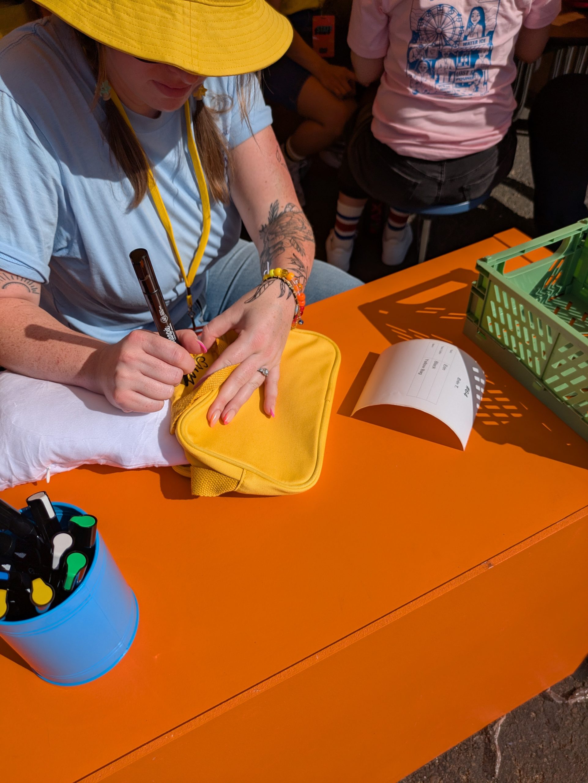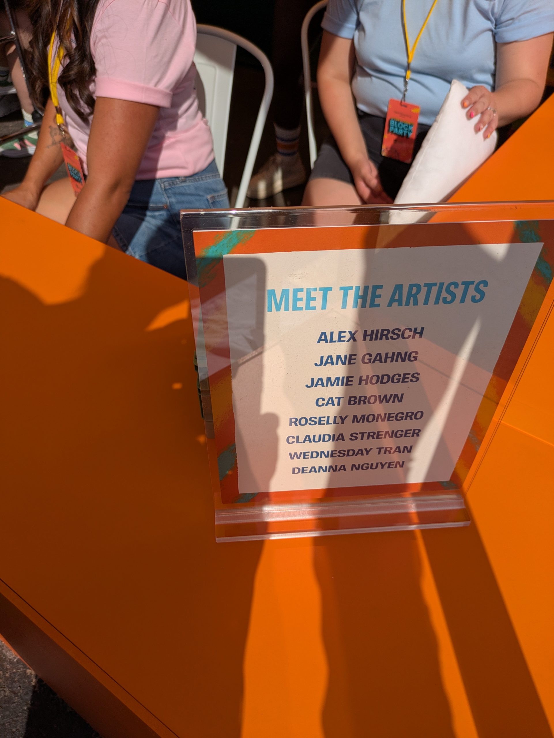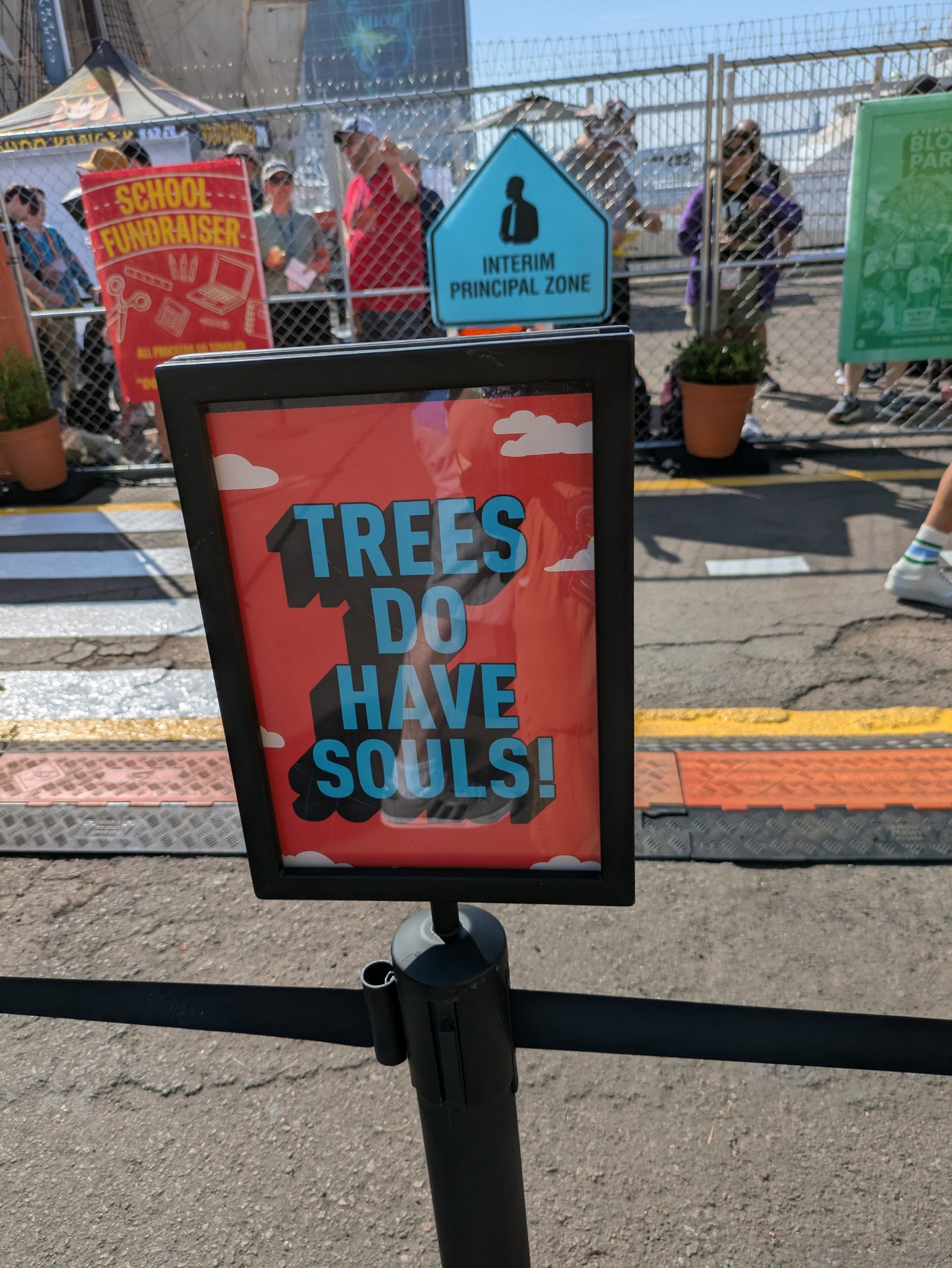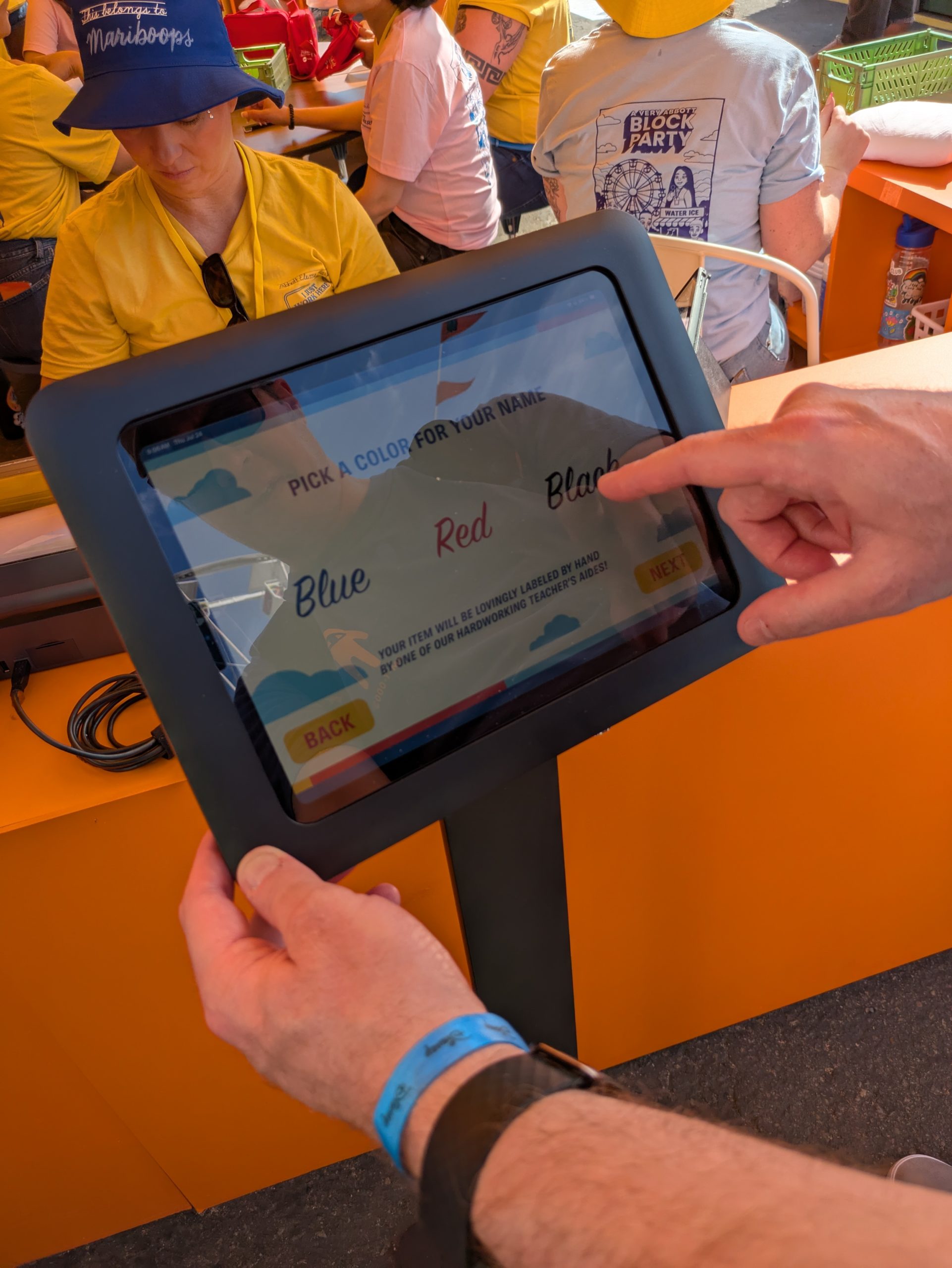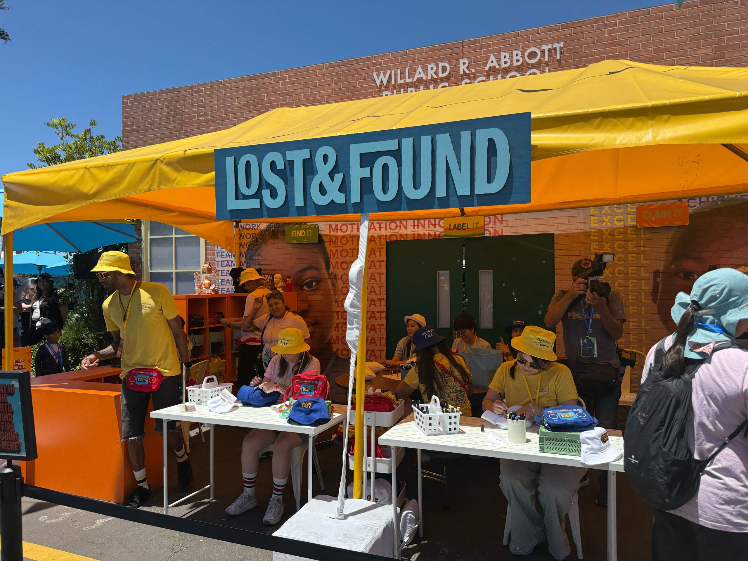 The “Lost and Found” swag station was hampered immediately by kiosks that were unavailable due to overheating, having been placed in the direct sunlight with no shade, an issue that made even the working kiosks difficult to read. A crowd quickly formed in the area, with folks waiting for an available kiosk, and others waiting for their hat or bag to be hand-personalized by the small group of artisans and then be dispatched to another person who would use a megaphone to call the person forward to claim their property.