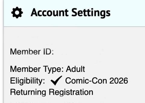 To see if you are eligible to participate in Returning Registration, log in to your Member ID account and look for the “Eligibility: Comic-Con 2026 Returning Registration” located in the upper left corner under your name, Member ID, and email.