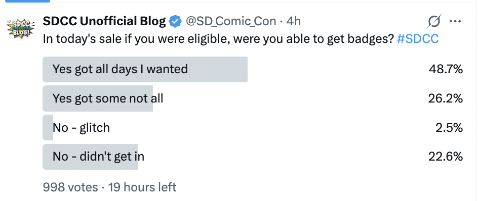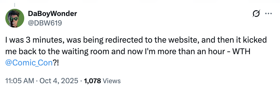 That’s about on par with last year — and in even better news, only 2.5% reported a glitch, versus 8% last year. If you were someone who was affected by an issue during today’s sale, we highly recommend you reach out to Comic-Con International here.
