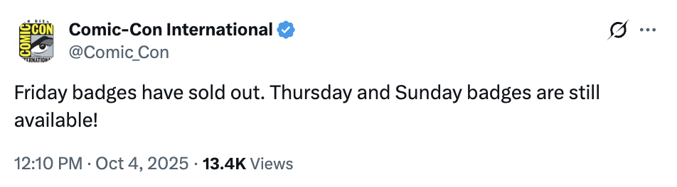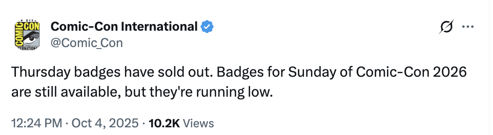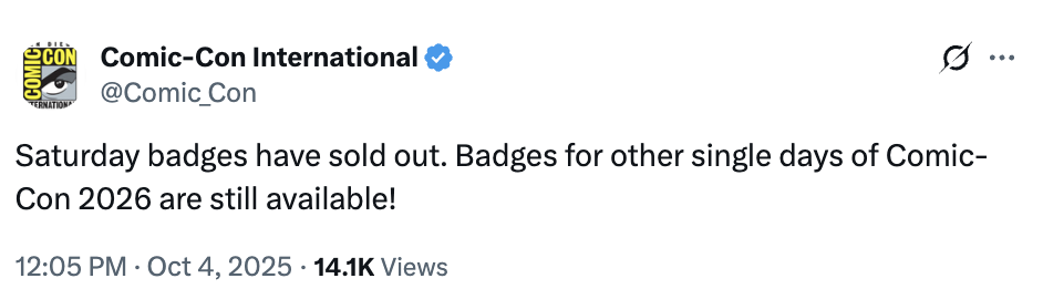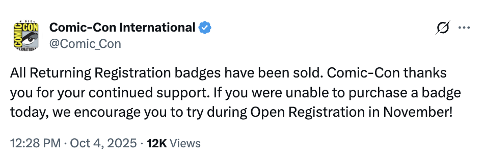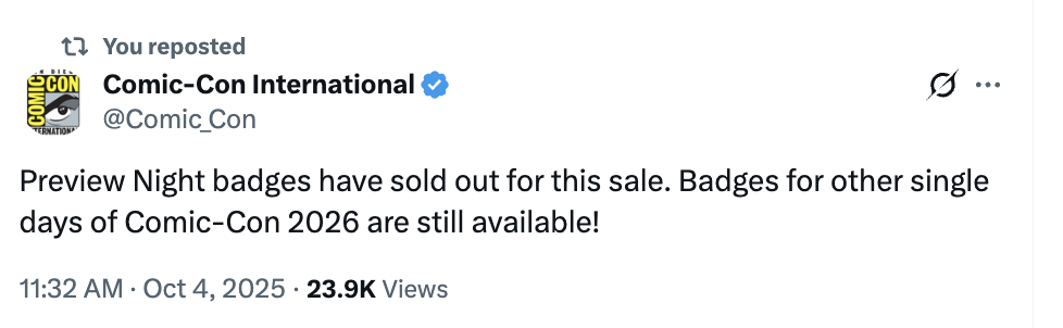 This sale is the first of two San Diego Comic-Con badge sales, with this one designated only for eligible returning general attendees (meaning those who attended 2025 as a general attendee).Â