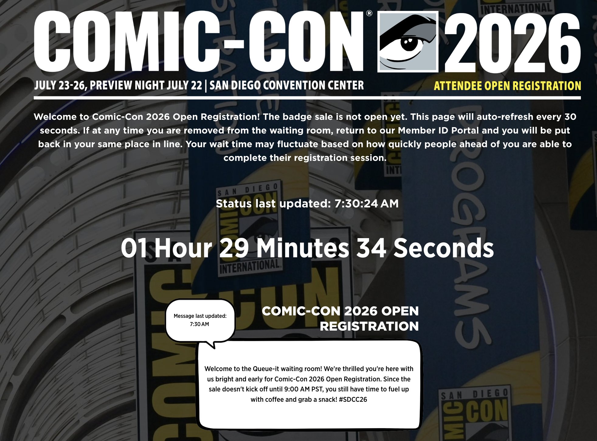 Last year’s Open Registration sale was met with some pretty large technical issues, to the point where the first attempt at the sale had to be paused, canceled, and rescheduled completely. So this go-around, it felt obvious that Comic-Con and Configio (the platform the sale runs on) were working behind-the-scenes to slow the sale down and keep things working at a slower, but steady, pace. We’ll take that any day over technical issues.