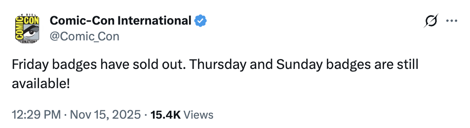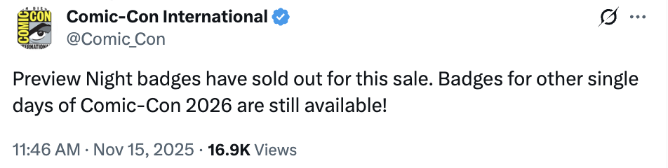 But we also think simply… demand may be down ever so slightly. Comic-Con is still the only comic convention that could (and does) sell out to this level on the same day, so we’re talking a very, very small drop in interest here. But considering you could theoretically join the sale towards the end of the wait time and walk away with at least a Sunday badge, that’s a far cry from the demand of the past. There’s a million reasons for this — the economy isn’t great, everyone’s budgets are tighter, many don’t want to travel internationally right now for a myriad of reasons.